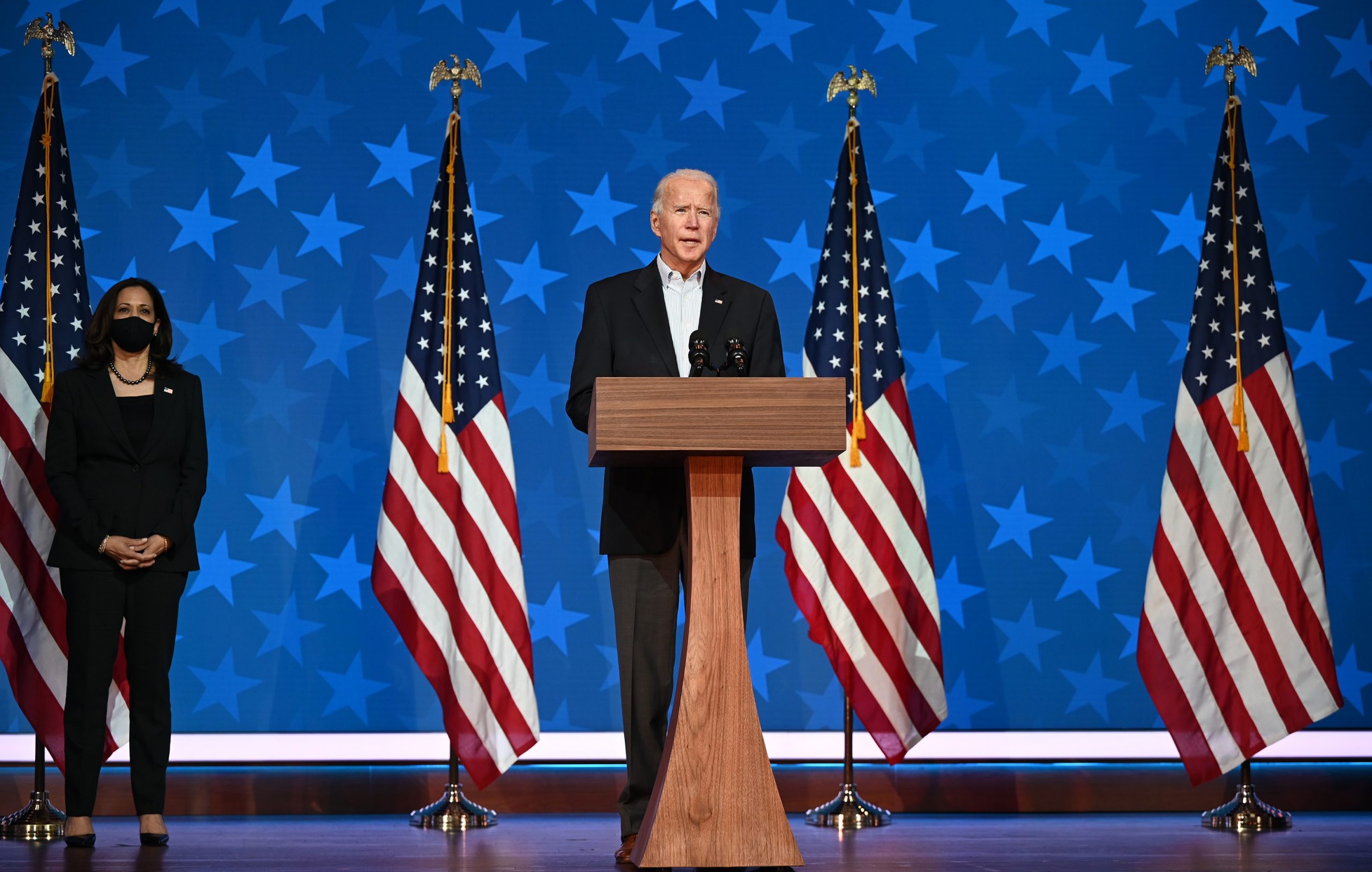 Embora tenha deixado dúvidas sobre 2024, em outro momento, o presidente americano havia dito que disputaria a reeleição. Joe Biden e Kamala Harris (ao fundo) em Wilmington, Delaware
