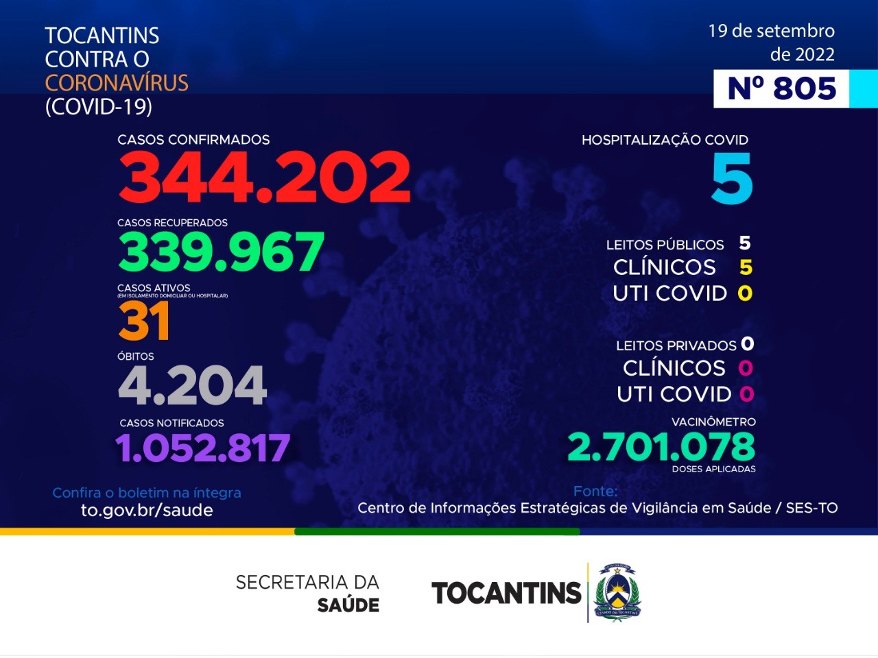 Atualmente são 31 casos ativos da doença no estado. Desde o início da pandemia o Tocantins soma 344.202 confirmações e 4.204 óbitos. Confira o bloetim epidemiológico desta segunda-feira (19)